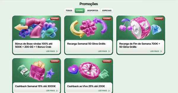 | Cashback Desportivo | 10% cashback até €500 | Aplica-se a perdas em apostas desportivas |